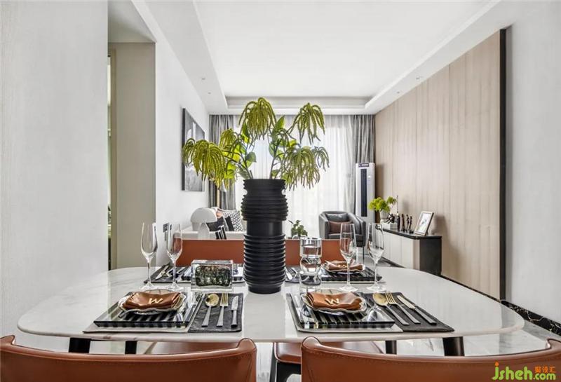 餐廳右側(cè)墻面木飾面為立面增添了層次感,餐桌與立面的色彩自然融合,精致的餐具是美食的好搭檔,享受一日三餐的味覺歸屬。質(zhì)感軟裝材質(zhì)和色彩與客廳呼應(yīng),壹抹綠意點綴出了餐廳空間中自然雅致的氣息。