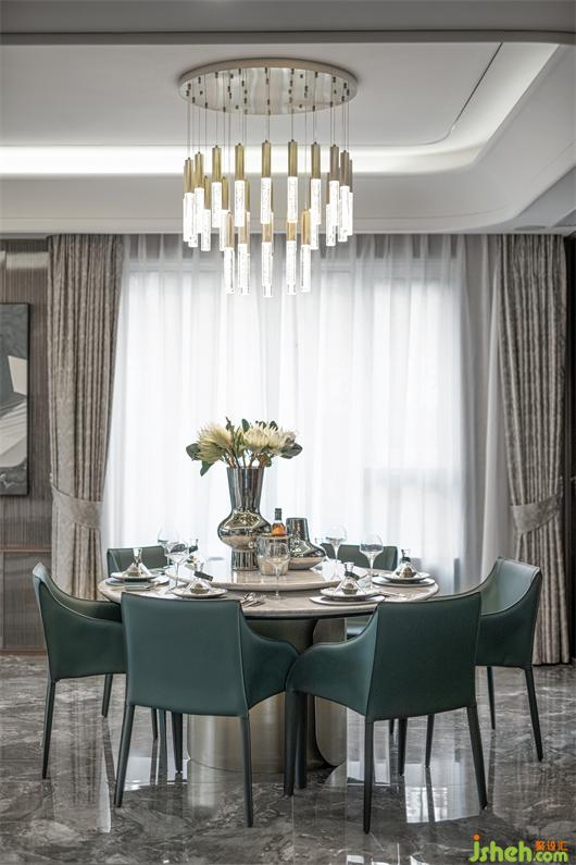 開放式餐廳坐落於客廳一側(cè),且以輕微的青色呼應(yīng)空間,在白灰色與金屬色的映襯下,餐桌采用大理石,樣板房設(shè)計與皮質(zhì)綠色包邊餐椅延續(xù)古典的優(yōu)雅與尊崇,材質(zhì)之間的呼應(yīng)與碰撞,回應(yīng)著品質(zhì)生活中的各種互動聯(lián)系,藝術(shù)品的裝點,恰恰暗合日常生活美學(xué)的構(gòu)建,明朗大方的色彩交織同時予人煙火氣的感受。