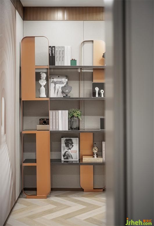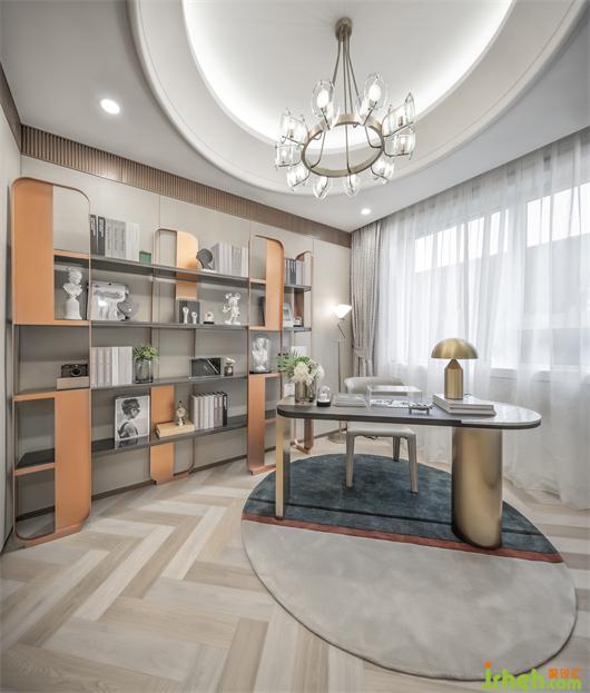 書房設(shè)計,樣板房設(shè)計從材質(zhì)到造型都具有獨特質(zhì)感。玻璃、黑金屬、銅,硬質(zhì)材料透射出精致輕奢感,而深淺顏色交織的地毯則帶有一種樸實的溫暖,其間的碰撞使得空間層次顯得更加豐富。莊重沈穩(wěn)的金屬展架,有了雕塑的輝映,變得有靈魂起來,小小的細節(jié)寄托了設(shè)計師內(nèi)心的情感,繁簡有度,空間變得更加完整。