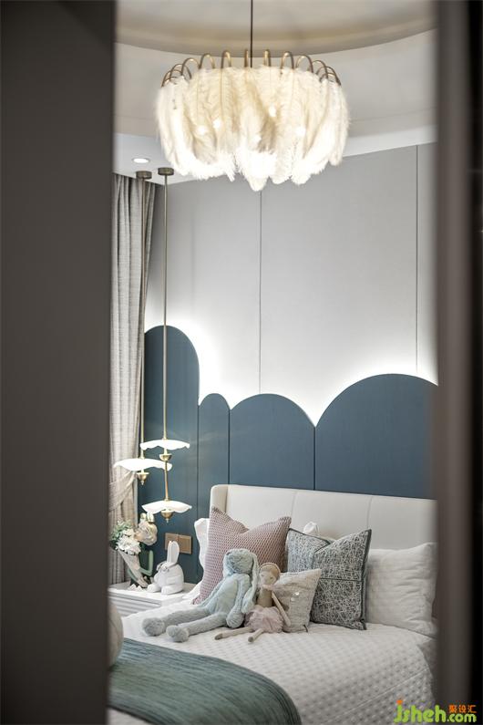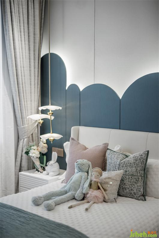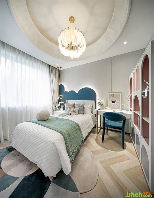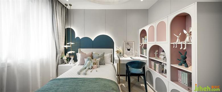 女兒房是清新柔暖的,樣板房設(shè)計師運用皮粉色與綠色的對撞、圓形與線條的幾何語素搭配、抽象掛畫與潮流玩偶的組合,在視覺上予人嶄新而又充滿活力的觀感,描摹出鮮活的空間性格,別致的裝飾元素,又讓此空間的趣味感和甜美感進一步凸顯。