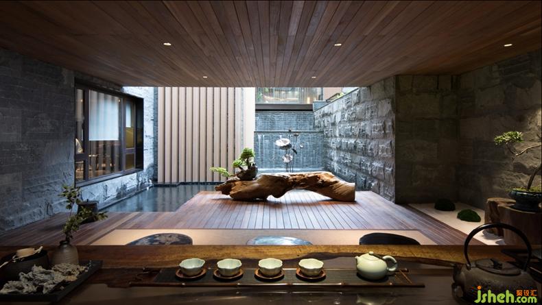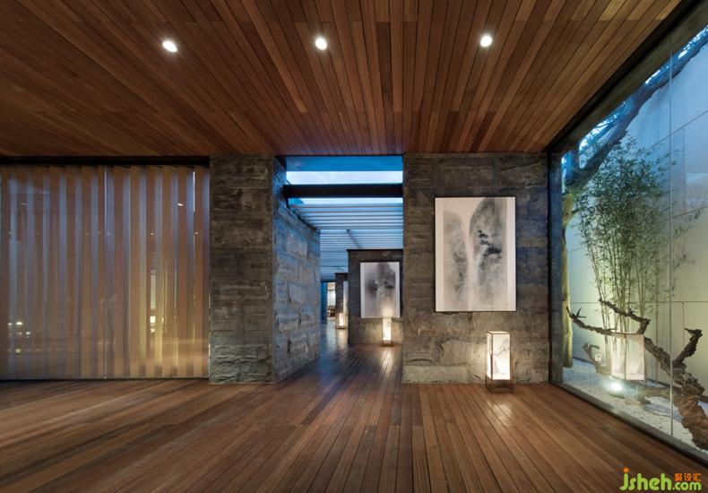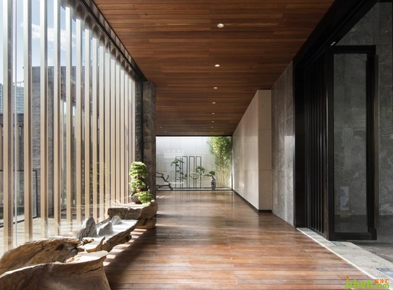 古時的書院是承載思想智慧的物質載體,中國傳統(tǒng)的智慧和趣處,就像一座座大山,身在其中,攀爬也自得其樂。“室內設計是建筑設計的延伸”這一設計理念在這里得以全面地展現。設計師提煉嶺南園林的精髓,融入傳統(tǒng)書院體系,采用現代手法演繹現代東方書院,將梁柱結構與坡屋頂的中式元素重新組合,擺脫了傳統(tǒng)書柜形式,形成新的空間元素運用至室內天花及空間各個部分;并將嶺南園林獨有的青磚灰墻置于室內且融于自然,大面積灰麻石粗曠的肌理與木材細膩的簡素本質相互碰撞,整個空間古樸莊重,一派淡泊天真之境。