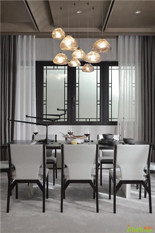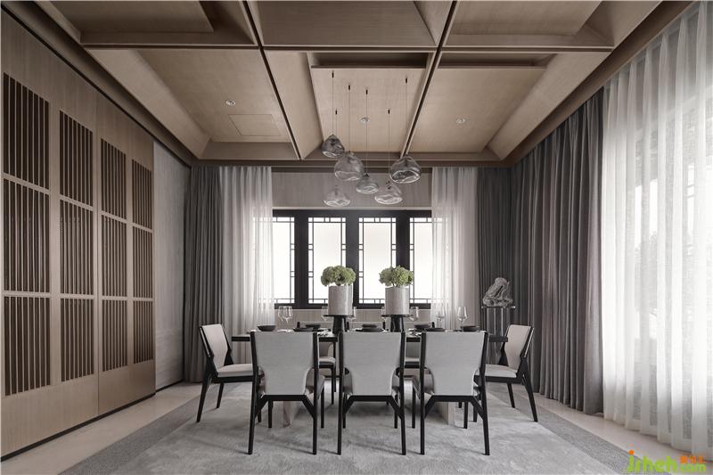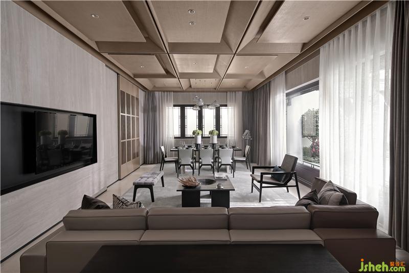 室內(nèi)公區(qū)天花提煉中式梁架結(jié)構(gòu)和坡屋結(jié)構(gòu),將其簡化為經(jīng)典九宮格木構(gòu)造型,用現(xiàn)代手法演繹中式韻味,天花與墻面在色調(diào)上的呼應(yīng)統(tǒng)一,強化了空間在視覺上的延伸感。一層作為生活起居空間,樣板房設(shè)計將客餐廳與室外完全打開,將更多的自然景觀引入室內(nèi),模糊室內(nèi)與室外、建筑與自然、人與自然的邊界,交互形成,渾然共生。