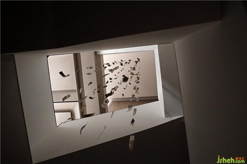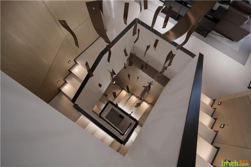 樓梯燈光設(shè)計選擇了更為人性化的點光源,從墻面透光到步梯,均勻分布,光感溫和、溫馨。一條以銅片為素材的手工藝術(shù)裝置輕盈如飄帶,貫穿別墅四層的樓梯天井。幾何硬朗與靈動輕盈,形成對比反差,也讓空間生動起來。