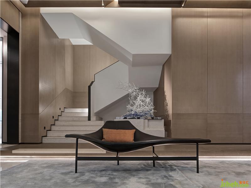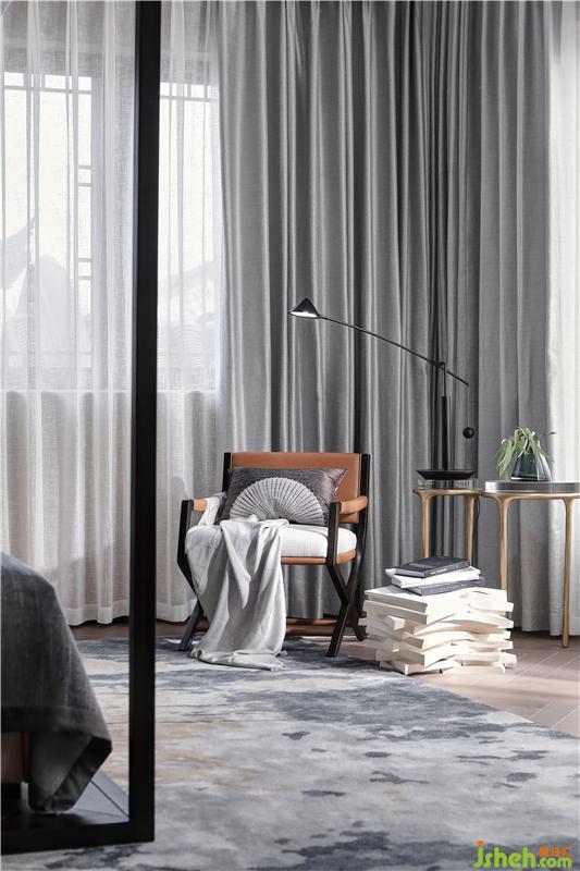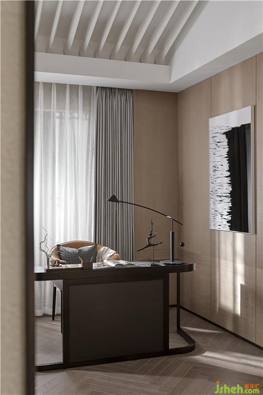 二層作為休憩空間,樣板房設(shè)計(jì)融合書房、衣帽間及浴室作為整體配套設(shè)施,以“梭”為形式設(shè)計(jì)的柜體天花,喚起童年時(shí)代的記憶,天花模擬自然天光,去除裝飾光源,營(yíng)造自然舒適的睡眠環(huán)境,休息區(qū)面朝戶外景觀,將自然攬入懷中。一把舒適的皮質(zhì)單椅,一盞意式極簡(jiǎn)臺(tái)燈,周末午后,拉開窗可見窗外怡人的雅典園林景色;或是疲憊一天后,關(guān)上窗簾,開一盞燈,翻閱幾頁林語堂先生的《生活的藝術(shù)》,陶情遣興。