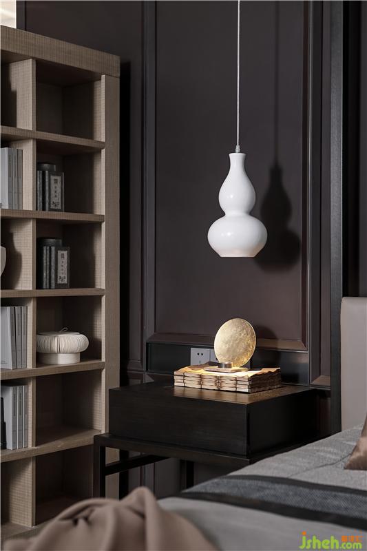 飲茶在嶺南文化中占有重要的一席之地,茶室意境與書房不同,更具傳統(tǒng)意韻。樣板房設(shè)計(jì)黃銅鑄造的吊燈如荷葉自然寫意,主人椅點(diǎn)亮主旨,客凳則由鉑晶樹脂與原木融合,東西交融意味十足。