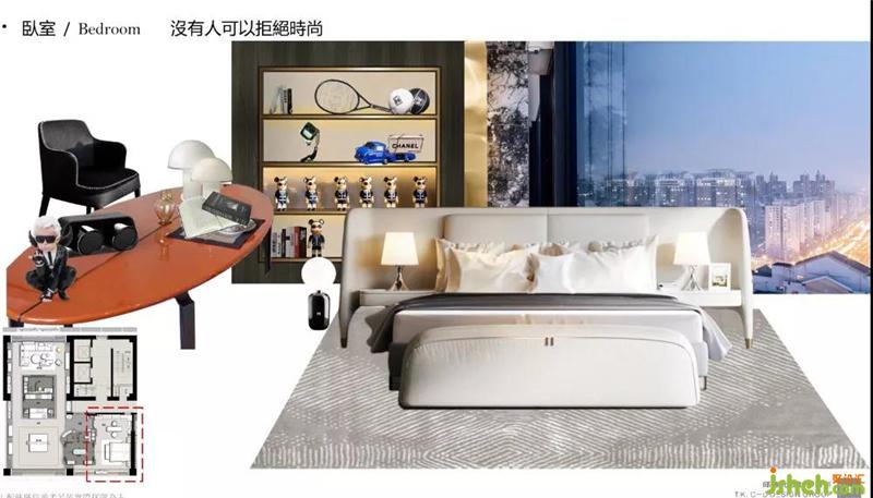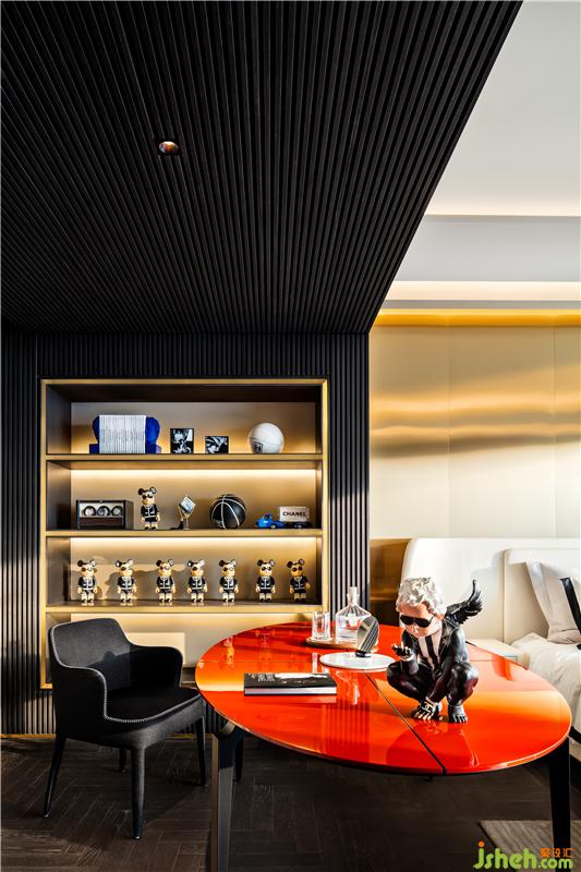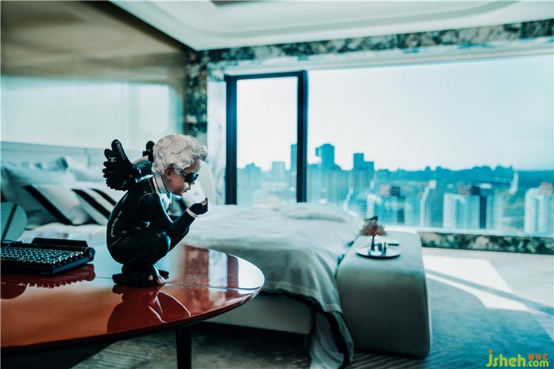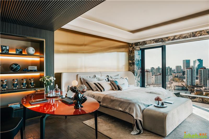 主臥套房以「老佛爺」卡爾·拉格斐為原型,呈現(xiàn)了一個(gè)活出豐滿獨(dú)立人格的傳奇人物的居室。壁柜上的香奈兒玩偶與陳設(shè)、書(shū)桌上以「老佛爺」為靈感的小型雕塑,鮮明地代出了這一空間的致敬主題。