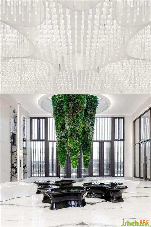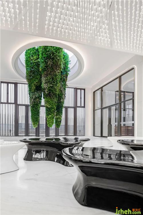 花瓣散落,在地面集聚成具備座椅功能的藝術(shù)裝置。黑與白并置,正如萬物的兩級彼此滲透、幻化,界限不清;其形態(tài)又似是泉匯而成潭、聚而成湖,將自然予人的喜悅與驚奇再現(xiàn)于會所的方寸之地。