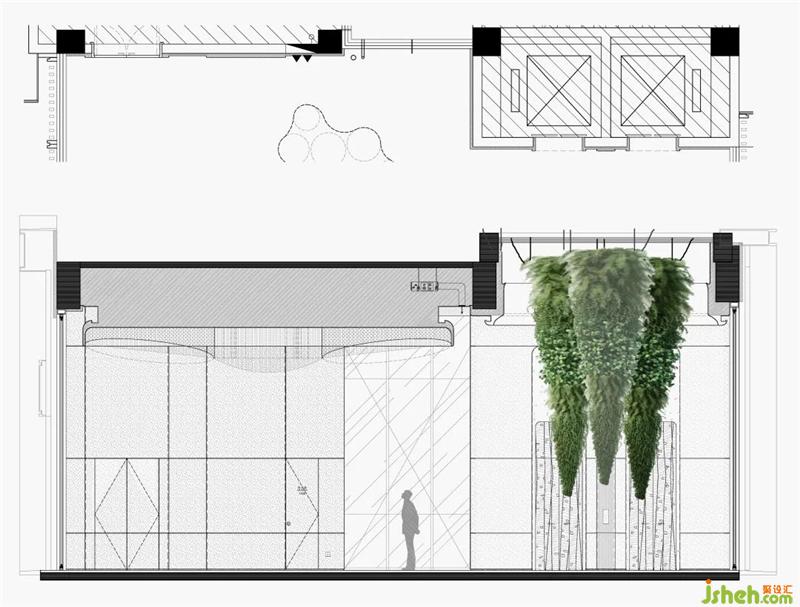 基于原始空間結(jié)構(gòu),我們以梯廳橫梁為界,將首層大堂一分為二。順著梯廳頂部的圓形天窗一組綠植裝置垂下,如同山林反向生長;北京會所設(shè)計自然光與燈光成為設(shè)計的「材料」,天空與室內(nèi)的邊界模糊朦朧、恍惚如夢,形成一種超現(xiàn)實的氣氛。電梯框的綠色石材,讓「山林」的故事更加完整;訪客沿著地面「行云流水」般的石材,換上愜意的心緒與步調(diào),進入空間的另一側(cè)——「花」的世界。