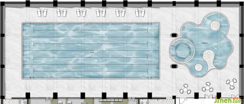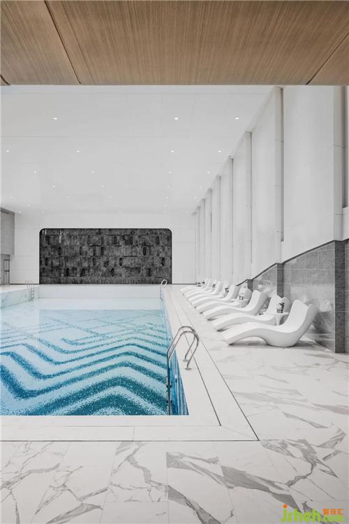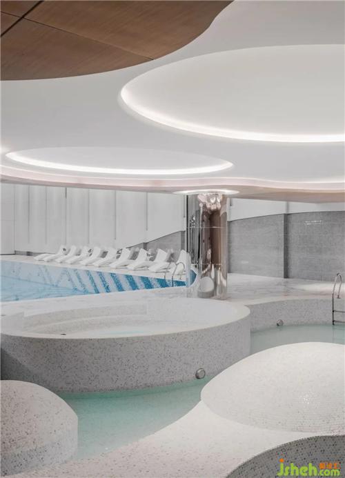 泳池空間,建筑原始結(jié)構(gòu)有兩排柱列,頗具古典空間的儀式感,卻與整體的基調(diào)有所差異。我們希望采用更為抽象、當(dāng)下的設(shè)計(jì)語言去重塑空間氛圍,留出「想象空間」的一隅之地,讓人能夠脫離現(xiàn)實(shí)的桎梏,浮游于萬物原初的混沌。依托空間的L型結(jié)構(gòu),我們劃分兒童區(qū)與成人區(qū),并用材質(zhì)的變化來弱化柱體結(jié)構(gòu)、豐富空間的層次。