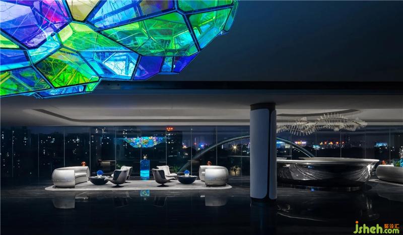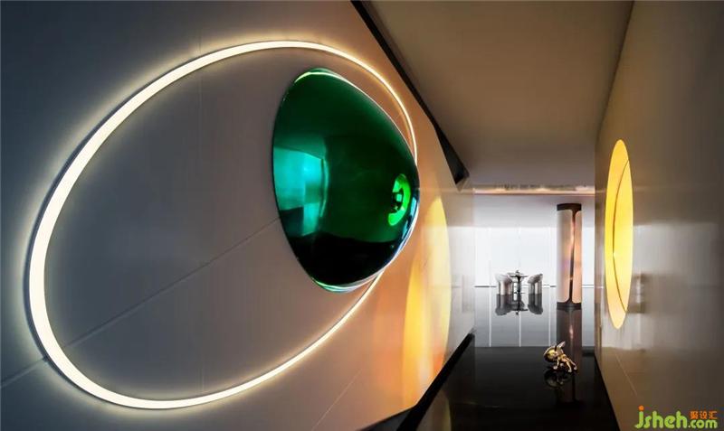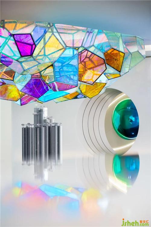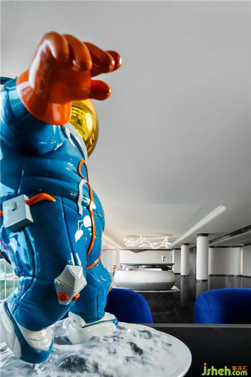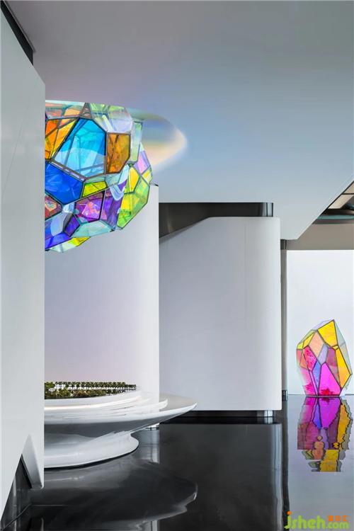 超過半數(shù)的藝術(shù)擺件并未采用「ALTTA來自星球」產(chǎn)品的常規(guī)尺寸,而是依照空間尺度而專門定制,每個IP人物都朝著訪客所在的方向,期待某刻靈魂覺醒,細(xì)細(xì)講述天際見聞??臻g以白色為主色調(diào)——它具有最廣的光譜范圍,東莞售樓處設(shè)計(jì)也是宇航服的常用色。像是陷入冰河時代,萬物驟然凝固,液體依托墻面或柱身在,于將靜未靜之隙,留下曾經(jīng)奔涌的實(shí)證。在此之上,宇宙的蔚藍(lán)無盡、隕石的炫彩斑斕便有了依托,充分彰顯自我的存在。沙盤區(qū)以人造石為底、「隕石」(即《奔星》)為頂。作品《奔星》緣起于藝術(shù)家華成2020特定時代背景下的悲觀沉思「是否地球已然不適合生活?」,在此命題下,衍生出對浩瀚星宇的向往、對親密關(guān)系的渴求及對未來生命的探討,又以奇幻的、絢爛的、神秘的視覺表達(dá),為空間注入充滿希望的、天馬行空的想象?!侗夹恰凡⒎庆o止不動,而是以光線的明滅起伏,與人的呼吸共頻,它借助技術(shù),成為某種獨(dú)特的「生命體」。