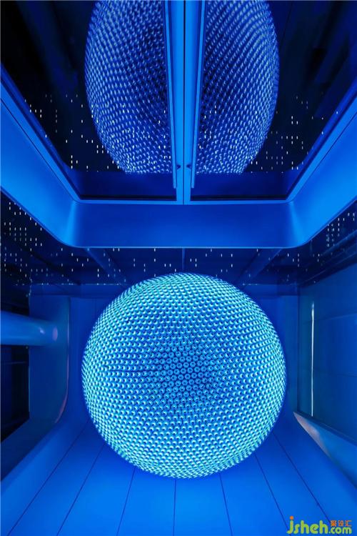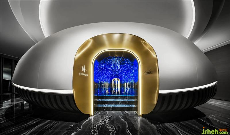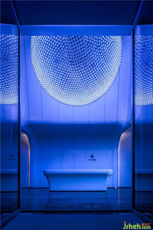 大約在30年前,Kevin Kelly(《連線》雜志主編)曾在《失控》一書中預(yù)判,稱「人造物表現(xiàn)得越來越像生命體;生命變得越來越工程化」。對(duì)待技術(shù)迅猛迭代,藝文界有人抱有一種「懷舊式」反感,又有人如KK般,將機(jī)器視作「我們的孩子」,一種獨(dú)立的生命存在形式。在東莞——一個(gè)以技術(shù)驅(qū)動(dòng)的城市,技術(shù)自然而然地成為了設(shè)計(jì)與藝術(shù)的材料?!柑祀H」,則成為一座技與藝共塑的向上、向新的美學(xué)價(jià)值與精神價(jià)值的容器。門廳處,藝術(shù)家鄭路的藝術(shù)品《0000FF》成為整個(gè)空間「開宗明義」之句。它屬于藝術(shù)家《差翅亞目之目》(即,蜻蜓之眼)作品系列,是一只復(fù)眼,由6200個(gè)個(gè)體組成,猶如生命體,在閃爍、呼吸,是生物和機(jī)器的聯(lián)姻,是無機(jī)物和有機(jī)物相互嵌套的結(jié)果。它的「同宗」屬于沙漠、大?;虺鞘锌臻g,因進(jìn)入室內(nèi),受限于對(duì)話和視看的方式而開啟一場(chǎng)「藝術(shù)進(jìn)化」東莞售樓處設(shè)計(jì)。