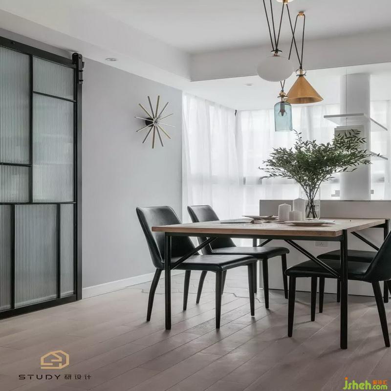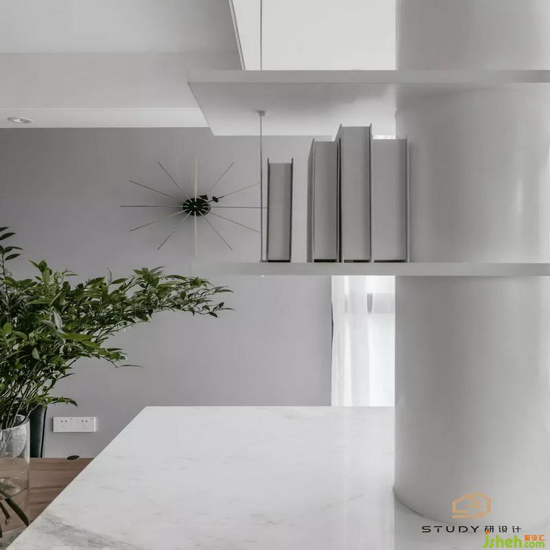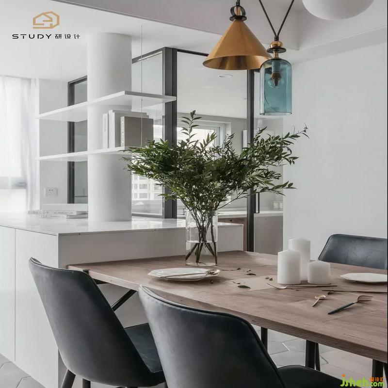 納入餐廳的北陽(yáng)臺(tái)有根落水管,室內(nèi)設(shè)計(jì)師索性包裹作為柜體的一部分,有時(shí)候阻礙你的可能成就你。