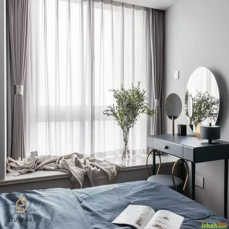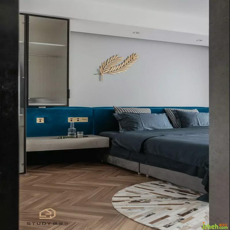 拉上朦朧紗簾,閉上勞累的眼睛,主臥書桌旁的綠色植物,室內(nèi)設(shè)計師搭配上藍色的床單和藍色的靠椅枕,給人舒適以及熟睡的感覺。