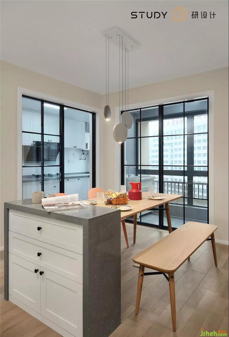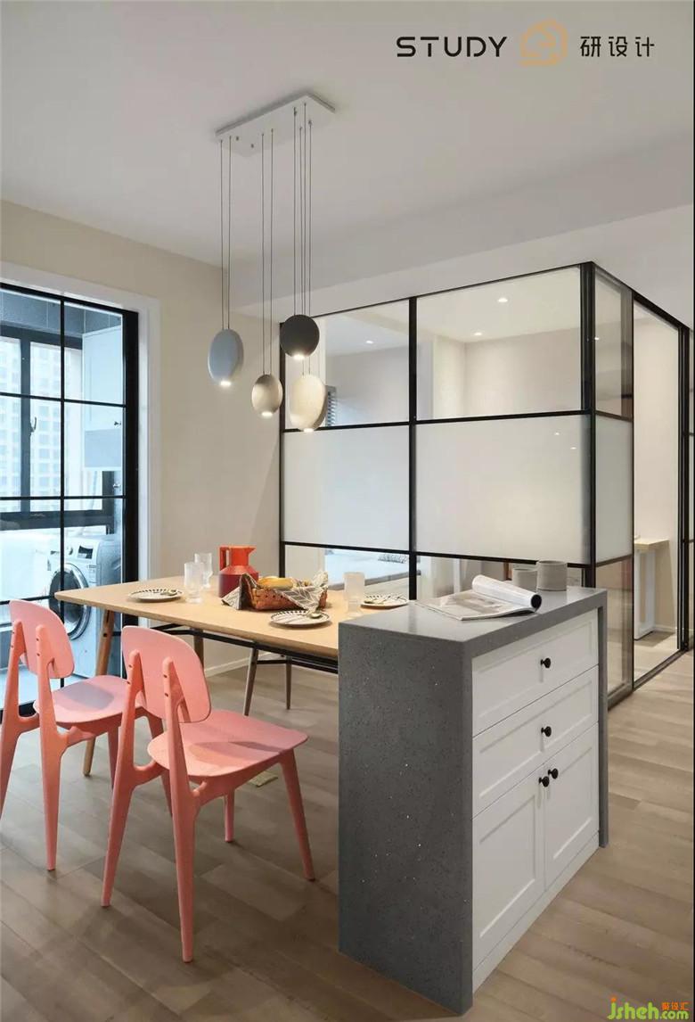 室內設計師用雙拼色餐邊柜,與木餐桌椅爭相呼應,既有收納功能,也符合業(yè)主顏色愛好,又方便業(yè)主的生活習慣。
