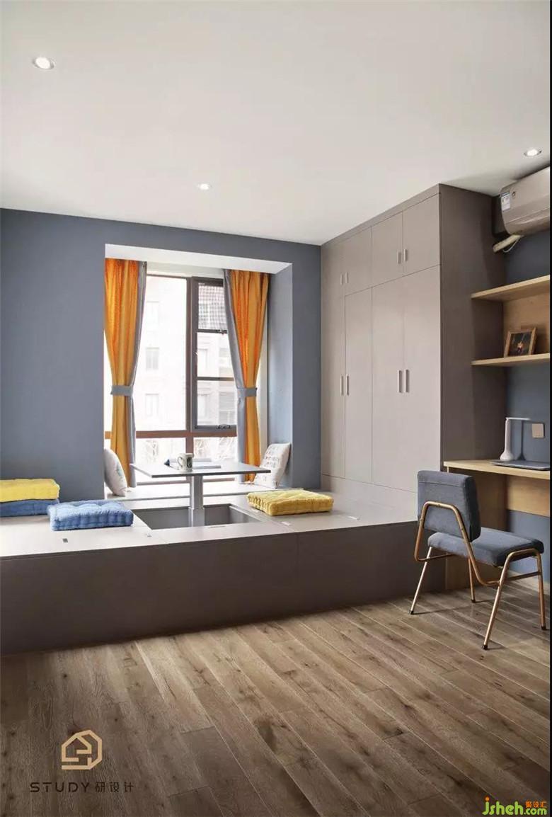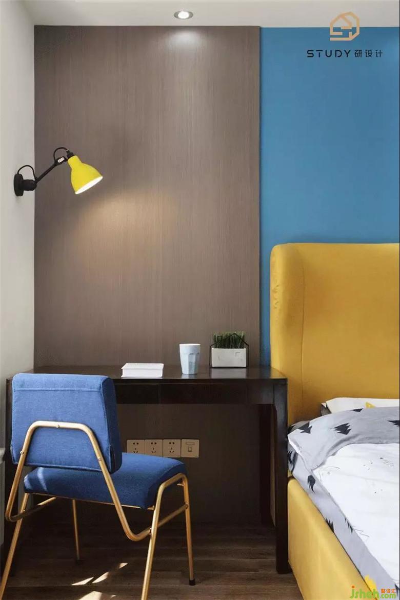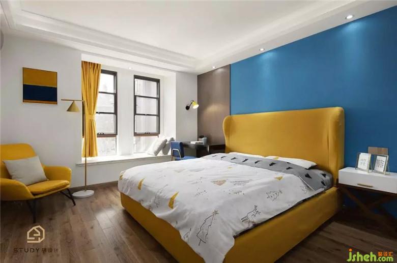 臥室室內(nèi)設(shè)計師選用了藍色的壁紙作為背景色,而床就是用黃色的點綴,讓空間顯得溫柔,舒適。