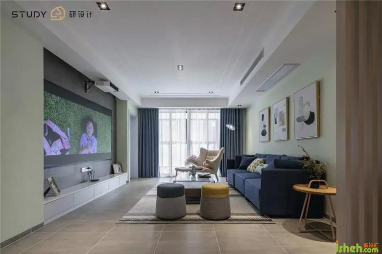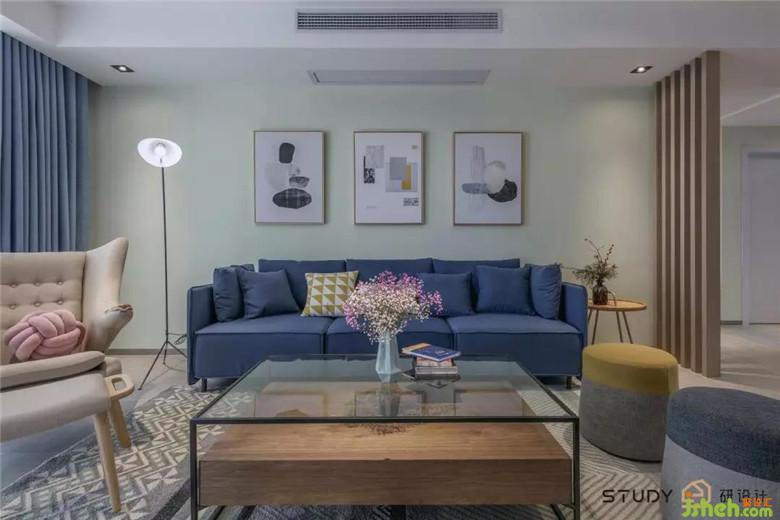 客廳作為待客區(qū)域,背景也以淺色為主,室內(nèi)設(shè)計(jì)師在軟裝搭配和家具上體現(xiàn)的淋漓盡致??蛷d中間寬大的主沙發(fā)厚重、舒適,海軍藍(lán)作為主沙發(fā)色,也成為整個客廳的點(diǎn)睛色,鮮明有活力、有生命力。