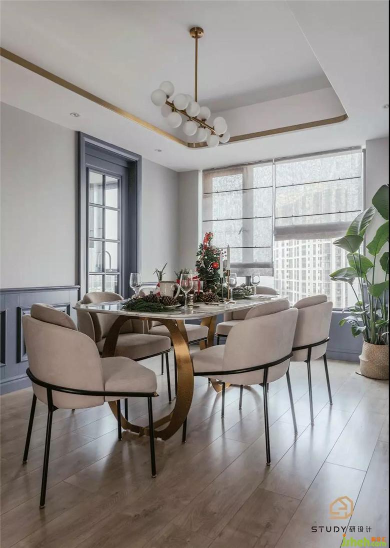 餐廳背景墻室內(nèi)設(shè)計(jì)師選用了的簡潔元素,在灰棕色椅子的映襯下,讓這片區(qū)域顯得更加明亮,帶給視覺極大地舒緩。