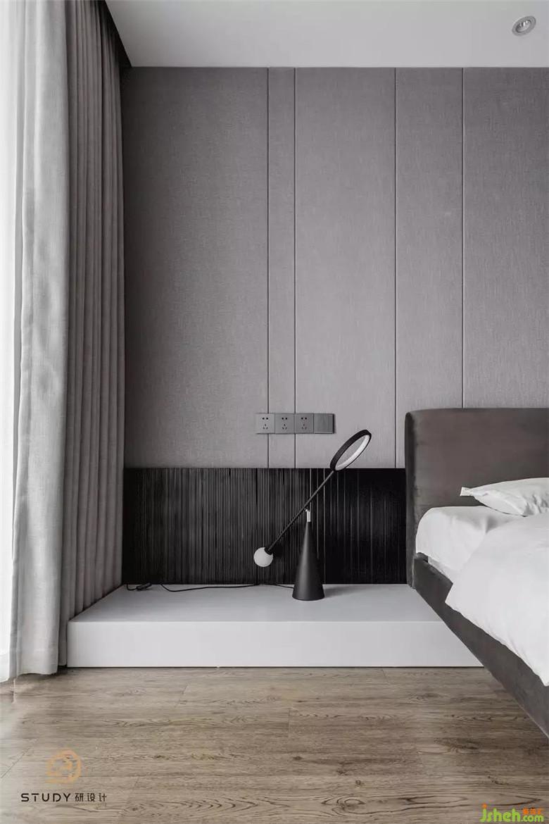 主臥空間配色以冷色調(diào)為主,有助睡眠,定制的寢具和床頭柜搭配充滿設(shè)計(jì)感的臺(tái)燈,高級(jí)感充斥著每一個(gè)角落。