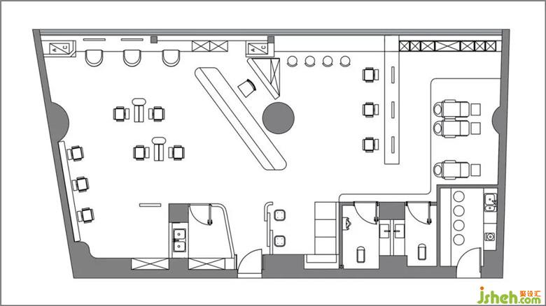 原始空間的入口處有一根直徑一米的圓柱,我們設(shè)置了一個(gè)傾斜的巨大吧臺(tái),弱化了圓柱給這個(gè)空間所帶來的擁堵感,圓柱也與吧臺(tái)形態(tài)呼應(yīng),充分調(diào)和了空間比例關(guān)系,超長的吧臺(tái)使得水吧與收銀臺(tái)一體化,大大增強(qiáng)了空間功能的多樣性。