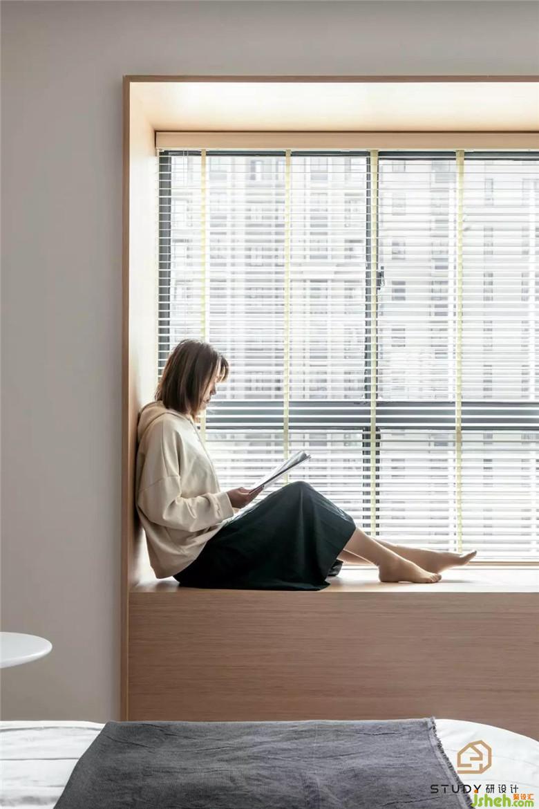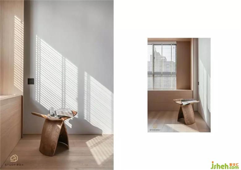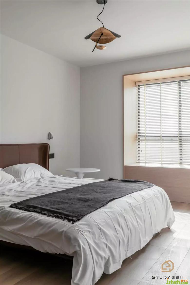 沿著走廊走到最深處,明亮溫柔的臥室就在這兒。有陽光的時候,墻面仿佛貼上了一張光影壁畫,跟隨百葉的調(diào)節(jié)改變心情。