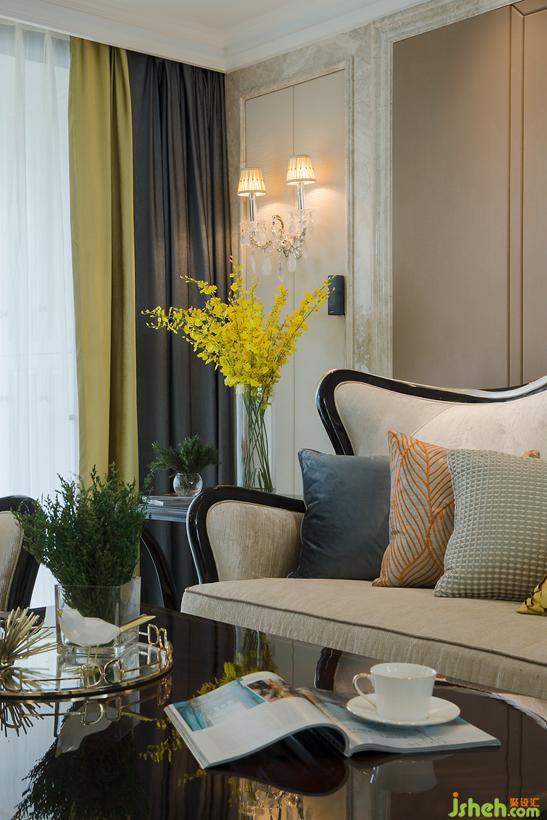 客廳小景,邊幾上的黃色植物和窗簾形成很好的呼應(yīng)關(guān)系。