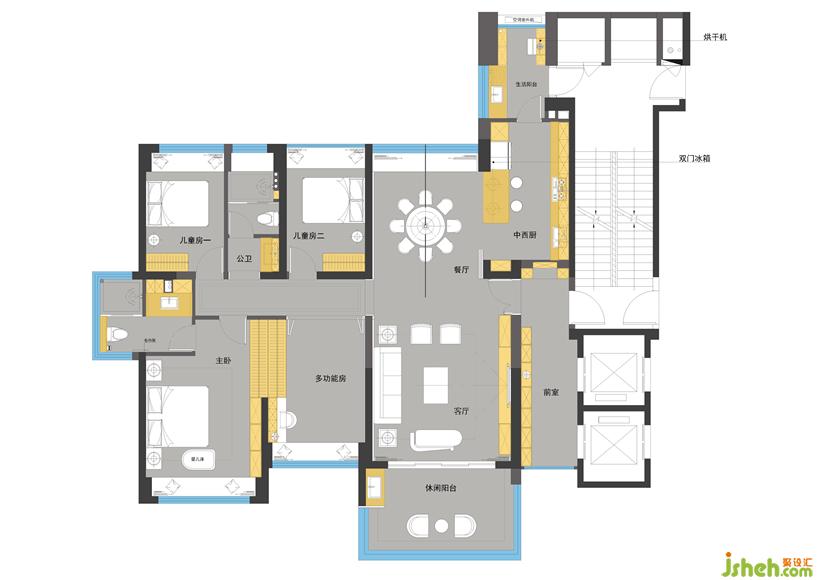 屋主是健談且熱愛生活的人,設(shè)計團隊考量到居住人口數(shù)不多,減少隔間數(shù)量,格局從原先4房變成3房,釋出空間讓渡給其他機能,放大私領(lǐng)域使用面積,公領(lǐng)域還多了書房空間,從而成為公私領(lǐng)域分水嶺,平時既可以當做書房。也可以做為小朋友的活動區(qū)。設(shè)計公司