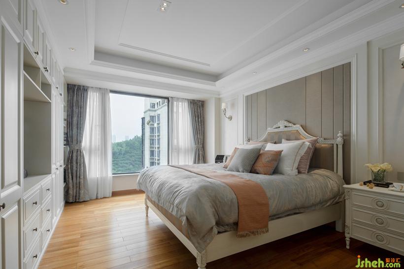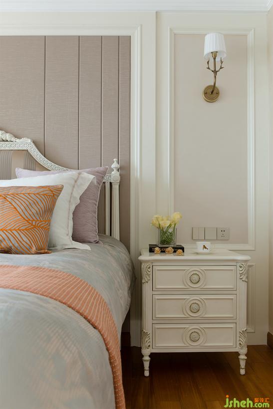 以淡雅色系搭復(fù)古白色床頭柜,營(yíng)造出溫柔且浪漫的舒眠氛圍。