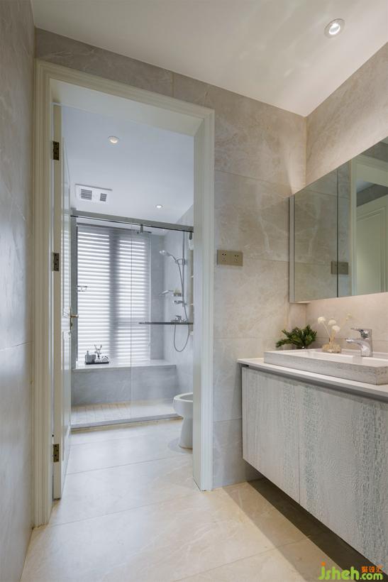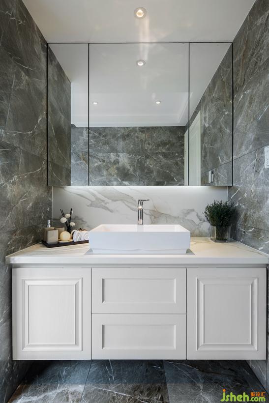 主衛(wèi)使用進(jìn)口磚呈現(xiàn)出石材紋理,洗手臺(tái)加入大理石點(diǎn)綴,鏡柜超強(qiáng)的收納機(jī)能讓屋主使用方便。