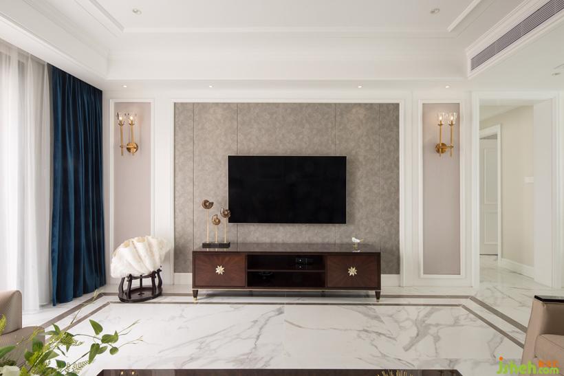 運營對稱的設(shè)計元素,強化電視主墻的儀式感,壁燈也起到了豐富空間光源的作用。