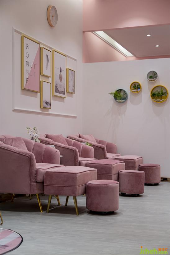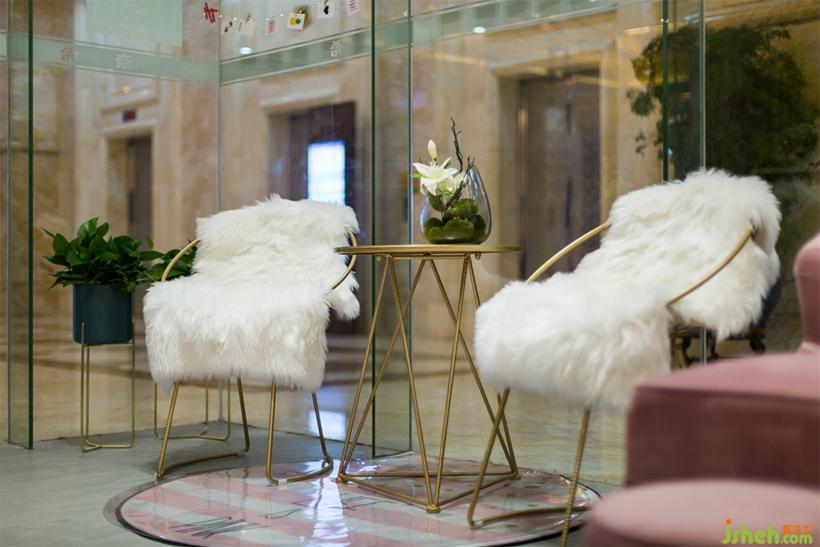 門口處休閑椅披著毛氈,精致托盤還乘著糖果,美腳區(qū)座椅也顯得敦厚柔軟。柔和繽紛的馬卡龍粉彩色,通過配飾參與其中,一起構(gòu)成如外文居家雜志的封面美感。