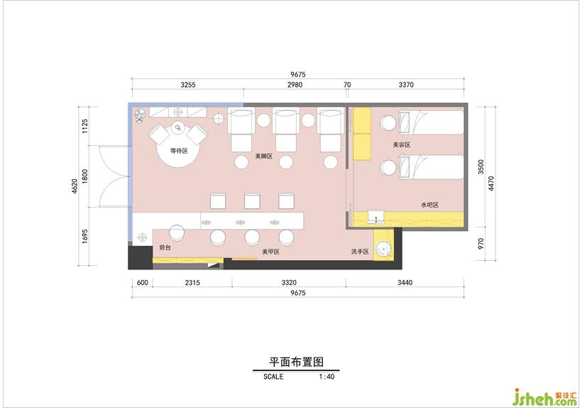 在42平的使用面積里,要同時(shí)保留開放,與私密區(qū)域的規(guī)劃,開放區(qū)必須容納完善的功能,要為等位的顧客設(shè)置的等待區(qū),要準(zhǔn)備舒適的尺度給美腳區(qū)域,方便美容師的操作。內(nèi)外都設(shè)置盥洗區(qū),使用空間互干擾。美甲桌結(jié)合吧臺一排拉通,小空間也能呈現(xiàn)出大器的空間體驗(yàn)。