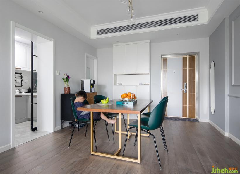 墨綠色餐椅吸引人的目光,現(xiàn)代感的銅色餐桌也同樣搶眼。設(shè)計(jì)公司