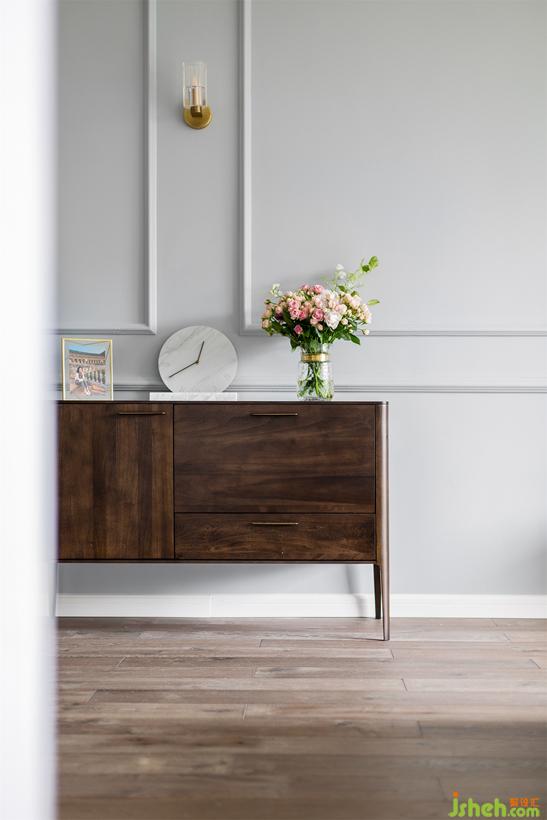 踏實(shí)的大地色系矮柜,淺淺的古典的線框、精致的容器裝著鮮花。方寸之間也可以蒔花弄草。