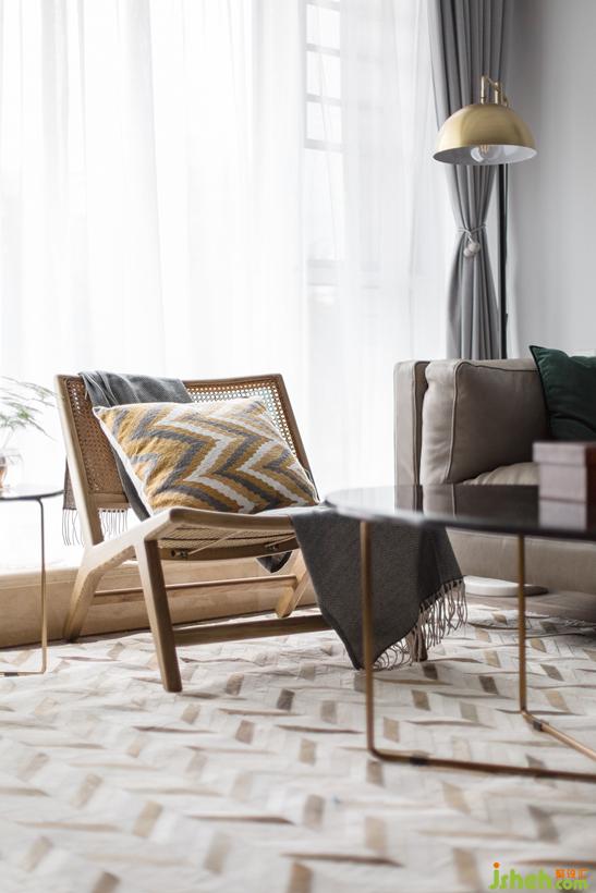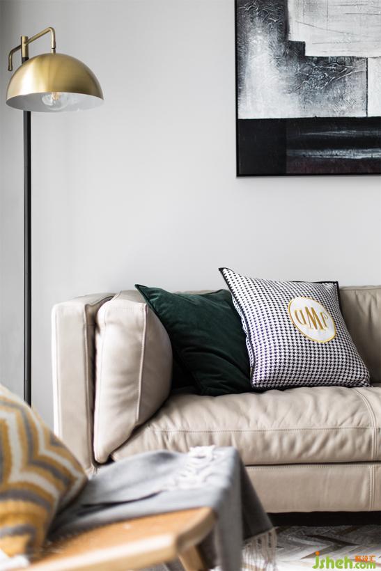 方便閱讀的孤傲銅色落地?zé)?、?yōu)雅實(shí)用的絨質(zhì)墨綠色抱枕、千鳥格的元素的加入。