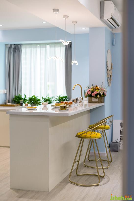 不能削掉柱子,結(jié)合吧臺(tái)做造型。收掉凸角