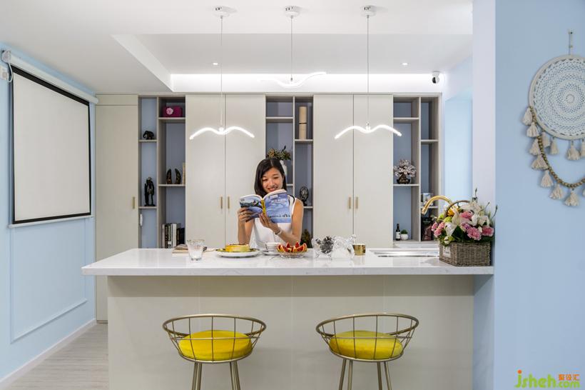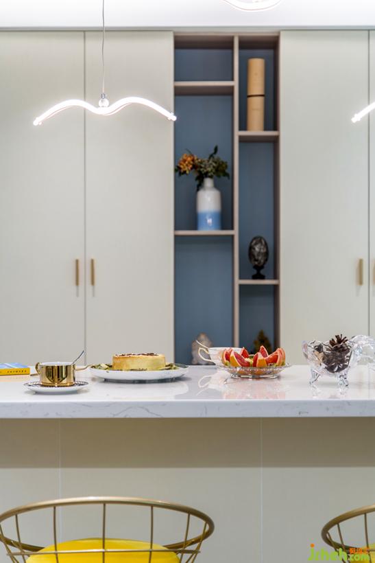 功能強(qiáng)大的吧臺(tái)柜。另一面藏著一個(gè)冰箱、一個(gè)消毒柜