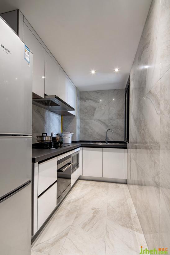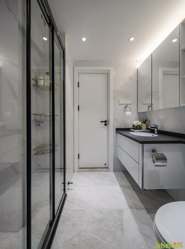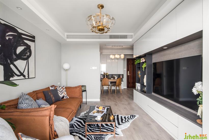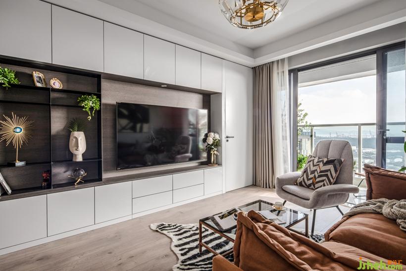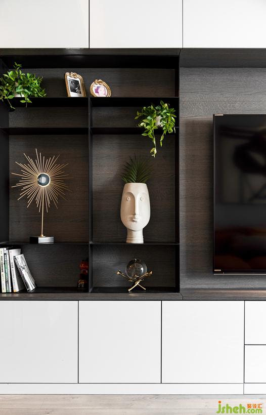 電視柜整合主臥門與設(shè)備,一路延伸轉(zhuǎn)至玄關(guān)處,空間體量無(wú)限放大。