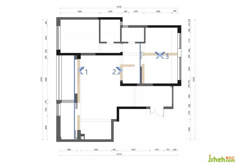 解決:將米色舊墻推至藍(lán)線位置,合適的比例,讓客餐廳氣勢更盛。