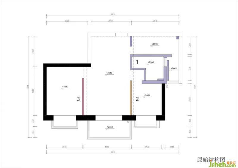 粉色區(qū):這堵墻很尷尬。擠到了主臥,切散了客餐廳,留下奇怪的凸角。裝修設(shè)計