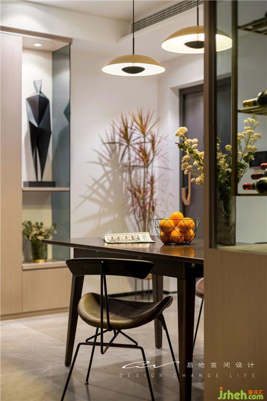 屋主平時(shí)收藏的酒量不多,遂放棄傳統(tǒng)的酒柜設(shè)計(jì)。通過設(shè)計(jì)感造型與精選材質(zhì),用銅色吊件玄掛起來。酒柜下方柜體并沒有浪費(fèi),柜門開在過道使用。