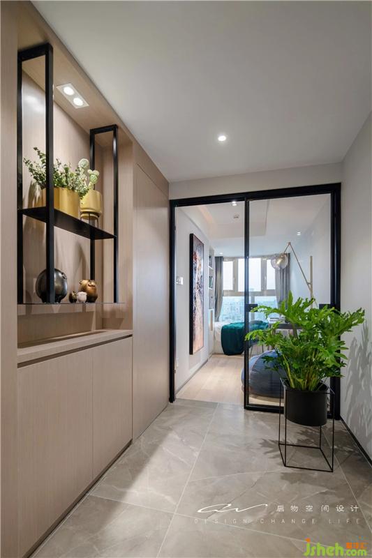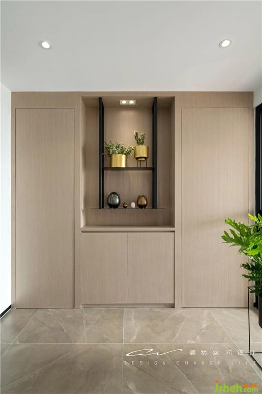 現(xiàn)過道明亮整潔。充分利用隱形門的優(yōu)勢(shì)整面的規(guī)劃。除兩側(cè)的隱形門外,中間有展示位,下方有儲(chǔ)物柜。裝修設(shè)計(jì)