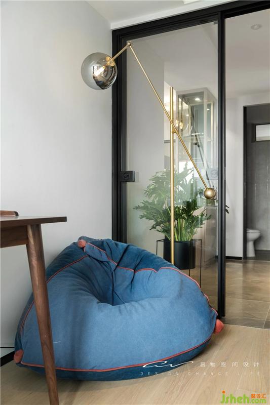 現(xiàn)床位是原陽(yáng)臺(tái)區(qū),重新規(guī)劃后兼具客房作用,后期只需將懶人沙發(fā)換成一個(gè)衣柜,功能皆備。