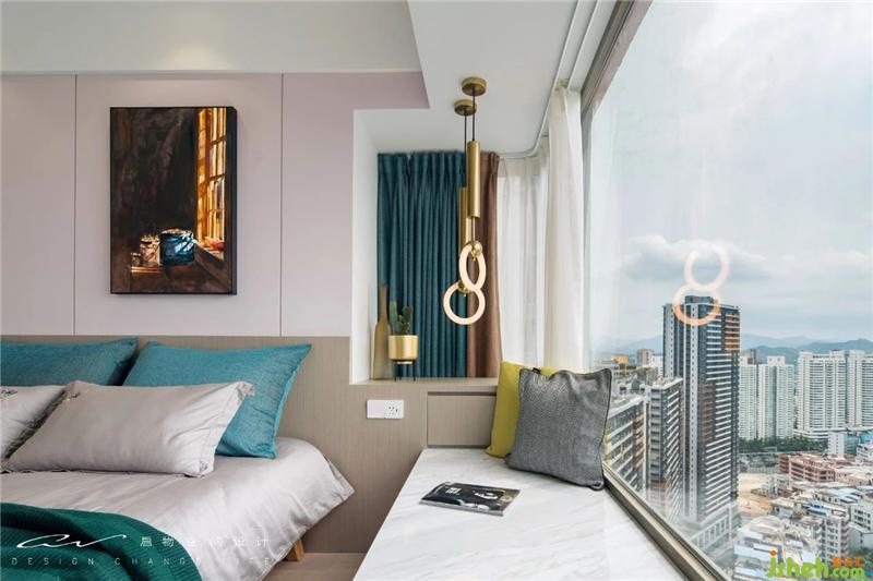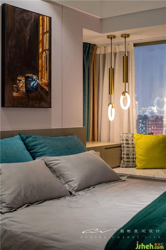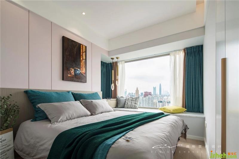 抱枕后方是抽屜,很好的利用上了飄窗死角位置。上面的平臺(tái)也作為床頭柜使用。裝修設(shè)計(jì)