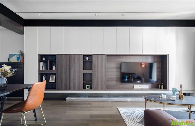 整墻柜體一反常態(tài) 用吊柜 不落地的造型 即使木紋顏色夠重 又沖突的感到它的輕盈 底下留空貼黑鏡 再次放寬客廳