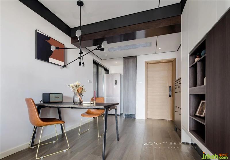 餐椅皮料呼應(yīng)掛畫 天花梁位包上木皮與黑胡桃木桌面呼應(yīng) 吊燈釋放出張力 兩張餐椅使用靈活。裝修設(shè)計(jì)