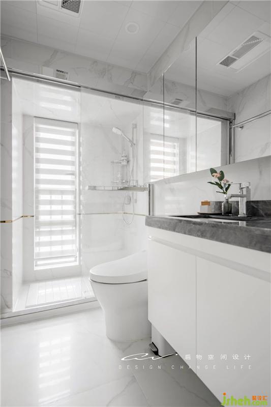 在墻面鑲鈦金邊裝飾線是 JiaQi 的想法 豐富白色空間 雙層百葉簾解決隱私問題 讓光線富有變化。裝修設計