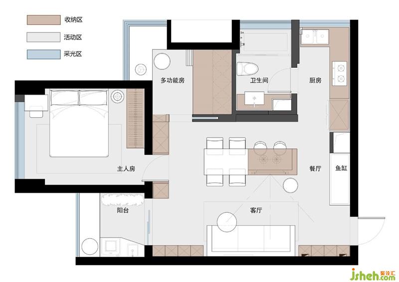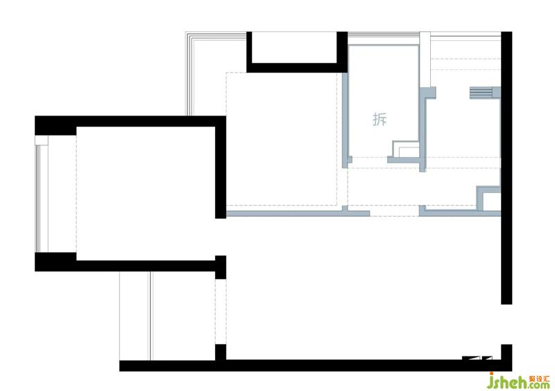 重新規(guī)劃后如圖,整個案例的思路是: 1.(敲重點?。┯霉褡觼硇嗡芸臻g。2.(敲亮點?。┛筒蛷d非常規(guī)的布局。消滅了純過道。