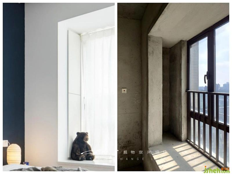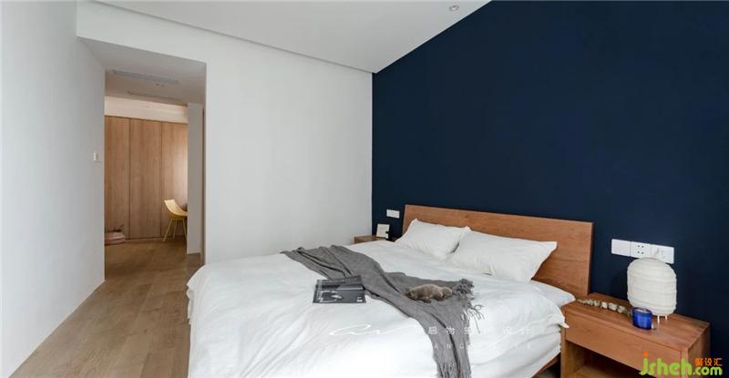 全房不施地腳線,主臥一片白茫,床頭刷中鐵藍表達寧靜。裝修設計