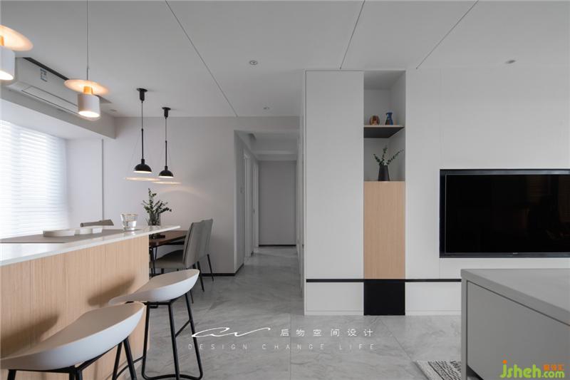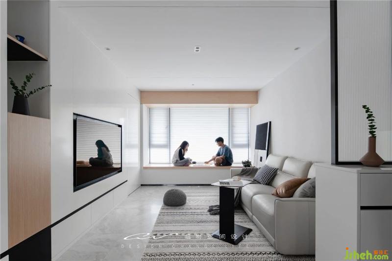 入戶第一眼是無壓感的空間。白色很難做出層次及距離感,因此小戶型慎用?。ň拖癜咨澴诱l穿誰胖一樣,白色是有膨脹感的顏色。)這里用天花線條拉長視覺縱深,用電視墻做中景拉開距離,做出視覺差異空間才會顯大。裝修設(shè)計