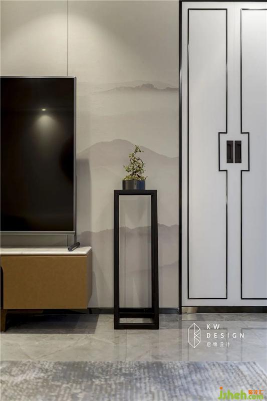 整體是中性灰色調(diào),墻面選擇中性淺灰色墻布,我們結(jié)合盧先生和劉小姐對生活的理解,以中國古典文化做背景。室內(nèi)設計師